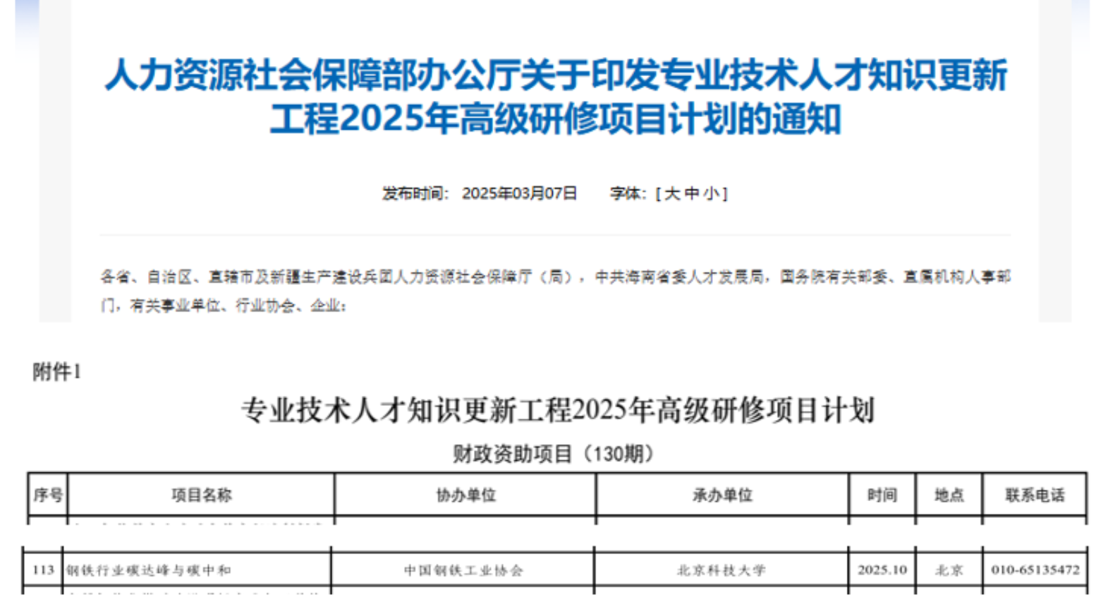 近日,人力资源社会保障部办公厅发布《关于印发专业技术人才知识更新工程2025年高级研修项目计划》的通知,由91传媒 继续教育学院承办的“钢铁工业碳达峰与碳中和高级研修班”再次获批。目前,继续教育学院已承办4期以 “碳达峰与碳中和”为主题的高级研修班,为钢铁行业培养造就一批创新型、应用型、技术技能型人才。