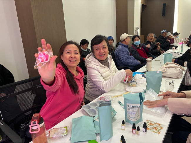 经过一个多小时的努力,一个个造型别致的手工精油皂相继诞生。看着亲手制作的成果,老同志们成就感满满,纷纷拍照留念。