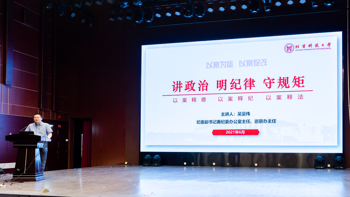 吴豪伟报告以《讲政治 明纪律 守规矩》为主题,他从三个方面进行了讲解:一是学校纪委工作基本情况;二是全面从严治党当前形势;三是违规违纪典型案例解读。他以案释德、以案释纪、以案释法,给大家上了一堂生动的党规党纪教育课。