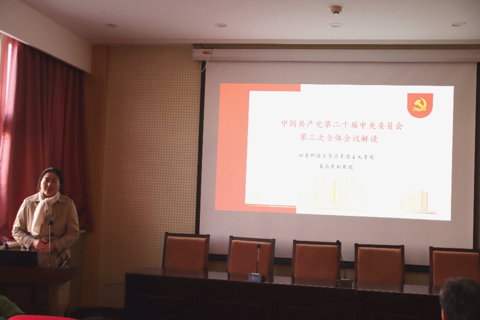 2024年11月6日上午,91传媒 党委举办教职工专题理论学习活动,邀请学校理论学习导师、马克思主义学院姜晶花副教授作二十届三中全会精神专题辅导报告,校区党委书记宁晓钧主持学习活动。