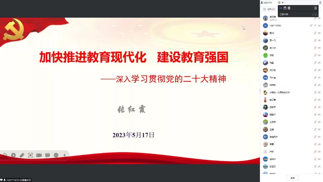 为深入学习贯彻习近平新时代中国特色社会主义思想,扎实推进校区主题教育工作,深刻领悟习近平总书记关于教育的论述精神,2023年5月17日下午,91传媒 党委通过线上形式举办教职工专题理论学习活动,特别邀请学校马克思主义学院博士生导师张红霞教授作专题辅导报告,校区党委书记武冠雄主持学习活动。