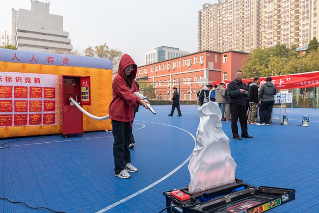 在消防模拟体验区,校区保卫科老师以及微型消防站的义务消防员给师生们详细讲解了应急逃生下的逃生要点和技巧、灭火器及消火栓的使用方法和注意事项,师生们在寓教于乐中正确掌握了消防设备的使用方法。
